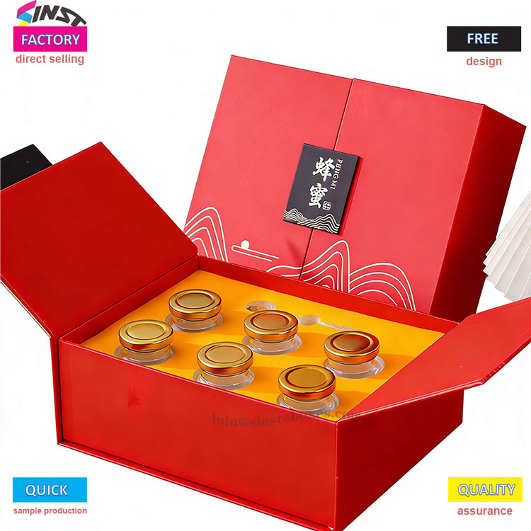 ກ່ອງຂອງຂວັນນໍ້າເຜິ້ງສີແດງນີ້ປະສົມປະສານກັບຮູບແບບຄື້ນທີ່ສະຫງ່າງາມດ້ວຍເຈ້ຍແຂງທີ່ມີຄຸນນະພາບສູງ, ມີໂຄງສ້າງທີ່ສາມາດພັບໄດ້ເພື່ອຄວາມສະດວກໃນການເກັບຮັກສາ ແລະການຂົນສົ່ງ. ກ່ອງຂອງຂວັນນ້ຳເຜີ້ງຮອງຮັບກະປ໋ອງແກ້ວຫຼາກຫຼາຍຂະໜາດ (ສຳລັບນ້ຳເຜີ້ງ/ໂທນິກ) ແລະມາພ້ອມກັບຊ່ອງໃສ່ໂຟມທີ່ກຳນົດເອງເພື່ອເກັບເນື້ອໃນ. ເຫມາະຫຼາຍສໍາລັບຂອງຂວັນວັນພັກ, ຂອງຂວັນທຸລະກິດ, ແລະການຫຸ້ມຫໍ່ຜະລິດຕະພັນສຸຂະພາບ, ສອດຄ່ອງກັບຄວາມຕ້ອງການຂອງຂວັນໃນຕະຫຼາດເອີຣົບ, ອາເມລິກາ, ແລະອາຊີຕາເວັນອອກສຽງໃຕ້. ກ່ອງນີ້ມີນ້ໍາຫນັກເບົາ, ທັນສະໄຫມ, ແລະປະຫຍັດຄ່າໃຊ້ຈ່າຍໃນຂະນະທີ່ເພີ່ມມູນຄ່າຜະລິດຕະພັນ.