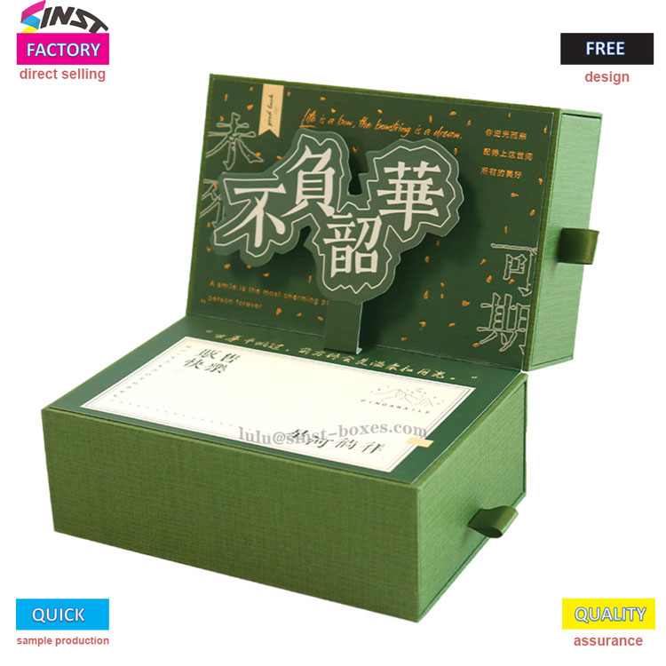 ກ່ອງຂອງຂວັນນໍ້າຫອມນີ້, ເຊິ່ງຂາຍໂດຍກົງໂດຍການຫຸ້ມຫໍ່ແລະການພິມ SINST, ໃຊ້ສີຂຽວສົດເປັນໂຕນຕົ້ນຕໍ. ຮ່າງກາຍຂອງປ່ອງປະເພດລິ້ນຊັກໄດ້ຖືກຕິດຕັ້ງດ້ວຍຕົວລະຄອນສິລະປະສາມມິຕິລະດັບແລະການຕົບແຕ່ງຄໍາ. ດ້ານຂ້າງຂອງກ່ອງຂອງຂວັນນໍ້າຫອມໄດ້ຖືກປະດັບດ້ວຍ "Shao" ແລະ "Qi", ແລະຮ່ອງ cushion ພາຍໃນແມ່ນມີຄວາມຫມັ້ນຄົງແລະມີກິ່ນຫອມ, ສະແດງໃຫ້ເຫັນຄວາມອ່ອນໂຍນ. ການຢູ່ຮ່ວມກັນຂອງຈິດໃຈສິລະປະແລະຄວາມຮູ້ສຶກພິທີກໍາແມ່ນທາງເລືອກທີ່ມີຄຸນນະພາບສໍາລັບການຖ່າຍທອດອາລົມ.